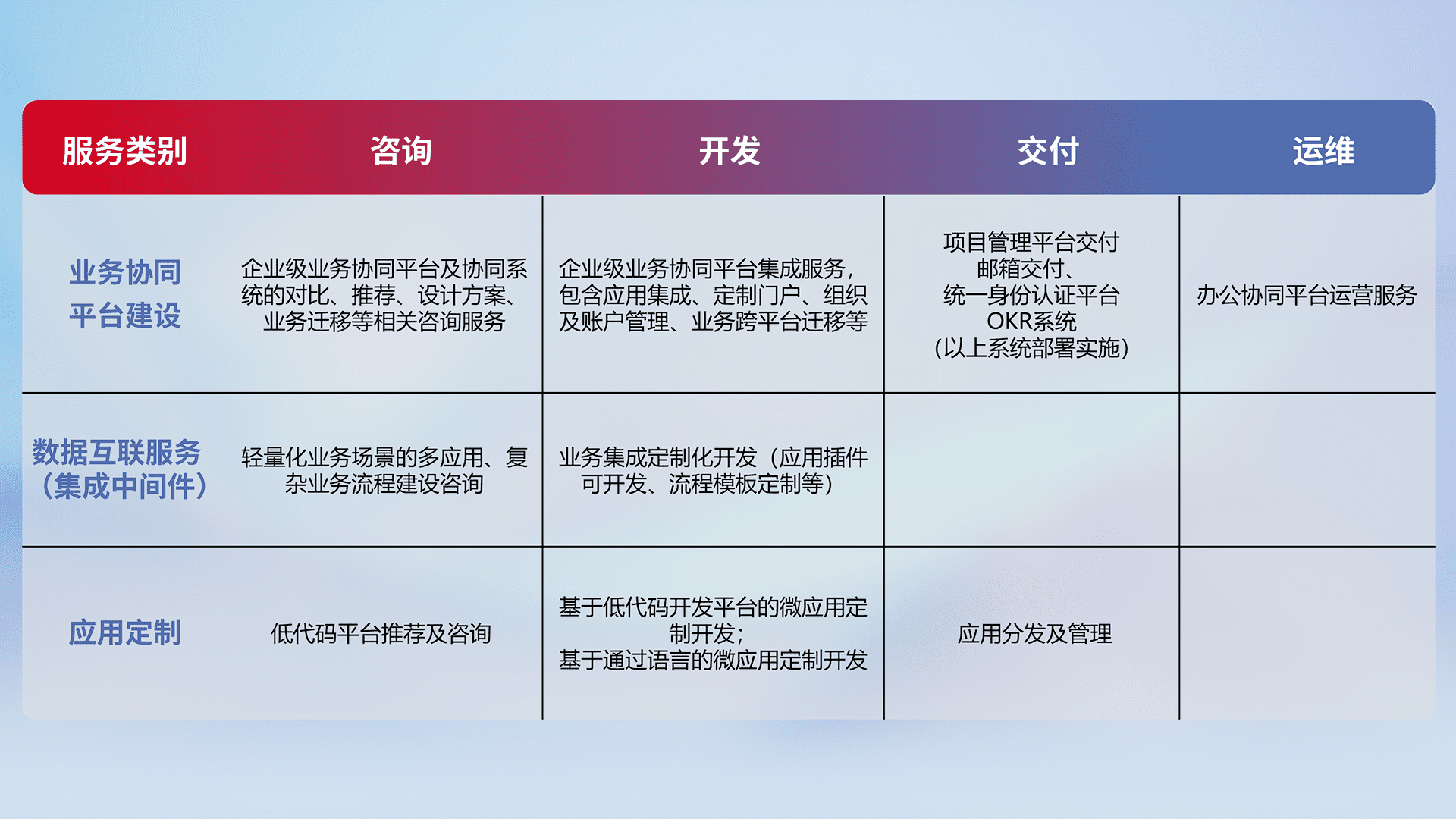 针对钉钉、、企微、、IDaas等平台级产品提供产品的规划、、、方案、、交付、、定制化开发等服务,,,实现如统一协同办公、、、、智能客户服务、、混合会议管理、、、智能数据查询、、、、等业务场景,,,,实现数字化转型。。