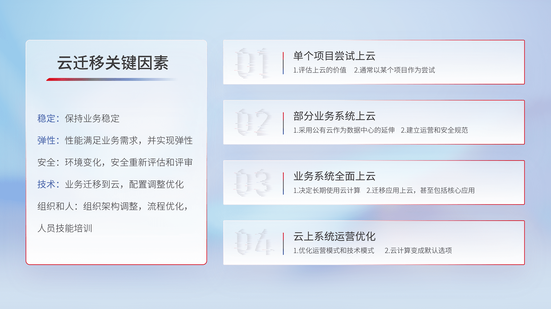 结合实际业务,,,从规划设计、、云平台选型、、、云原生改造、、数据迁移、、、、集成交付,,,,迁移全过程为客户识别最佳上云路径,,,做好风险识别管理,,,,设计网络架构、、、、身份权限、、、安全审计合规、、、、操作审计、、、、日志审计、、监控告警策略、、、、多站点容灾设计等,,,,对云上基础设施进行整体规划,,,,提升IT治理水平,,,以满足弹性、、、、高可用、、、、高性能的需求。。。。