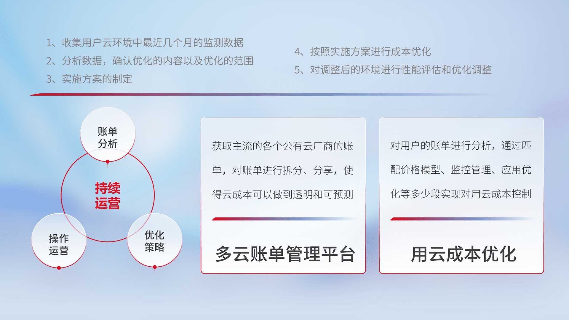 通过多云纳管,,以统一的资源数据模型把客户的云资源进行抽象和封装,,进而实现对多云资源的统一操作,,,保障云资源管理的可靠性、、稳定性与可用性。。量身定制化运维内容,,,配置、、、、开发运维、、、补丁管理、、、备份、、监控、、认证和访问管理、、审计和日常巡检等,,,保障在用云过程中的可靠度,,稳定度以及高可用率。。。