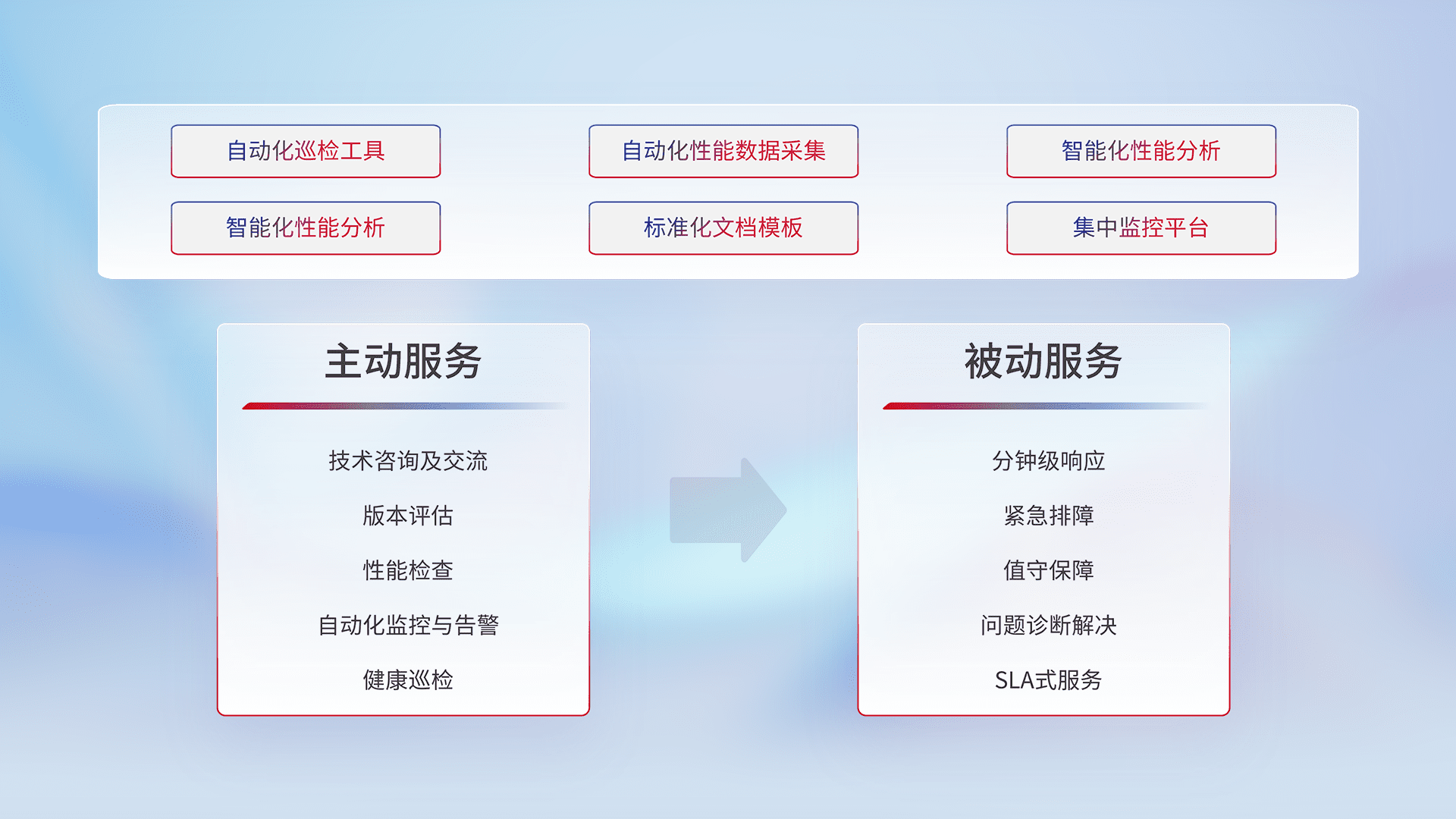 智能化工具和标准化文档,,保障服务质量,,,提供主动服务(包含技术咨询、、、版本评估、、性能检查、、自动化监控与告警、、健康巡检)和被动服务包含(分钟级响应、、紧急排障、、值守保障、、、问题诊断解决、、、、SLA服务)。。