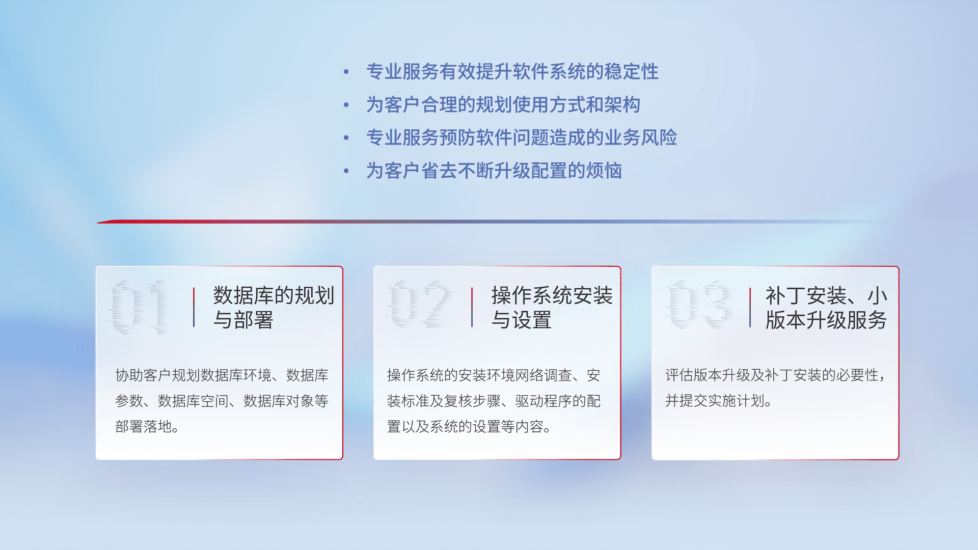 为客户提供软件规模升级、、、快速部署、、、、按需配置的专业服务,,从数据库的规划与部署到操作系统的安装与设置,,再到补丁安装和小版本升级提供支持。。